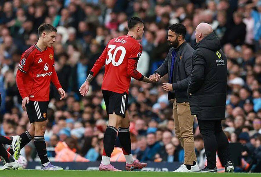 阿莫林总结道:「最大的不同在于,我们在转换进攻时没能得分,而下半场曼城把握得更好,我们在关键时刻吃了亏,我们本可以做得更好,这一点很明确。还是过渡的问题,第三个进球,我们的传球质量太差,大家都不知道谁去接球,结果对方就轻松得分了。第一个球,多库身处四人包围之中,当时我们本可以更积极主动些。在这类比赛中,我们必须做到完美,而在这场比赛中球队并未做到。这总是令人感到沮丧,因为我们创造了那么多机会,却未能进球。下一场比赛,我们需要在很多方面下功夫。」